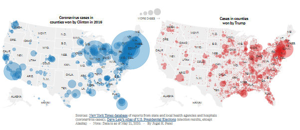 民主党人更有可能生活在病毒肆虐的县,而共和党人更有可能生活在相对未受疾病影响的县,尽管他们为此付出了经济代价。《纽约时报》的一项分析发现,美国总统特朗普在2016年赢得的县报告的病毒感染率仅为27%,死亡人数仅为21%——尽管45%的美国人生活在这些社区。