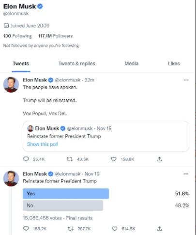 近日,推特新老板马斯克发起了一项投票,问网友是否应该解封特朗普的推特账号。最终投票结果显示,51.8%的网友投票选择了支持。马斯克随后发文称,“特朗普将解封。”2021年初国会骚乱发生后,推特曾以“存在进一步煽动暴力行为的风险”为由“永久封禁”特朗普的个人账户。