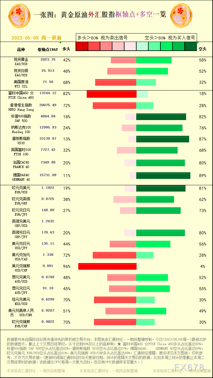 一张图:2023/05/08黄金原油外汇股指"枢纽点+多空占比"一览|原油
