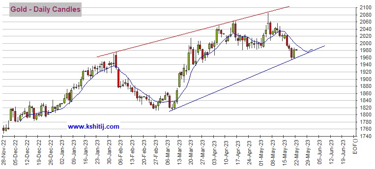 24K99讯 周一(5月22日)亚市盘中,美元指数维持日内跌势,目前接近103.00关口;黄金期货在上周五大涨逾20美元后保持坚挺,目前略高于1980美元/盎司关口。Kshitij咨询服务团队(Kshitij Consultancy Service)周一最新撰文,对黄金期货、白银期货、原油期货和铜期货后市走势进行前瞻分析。