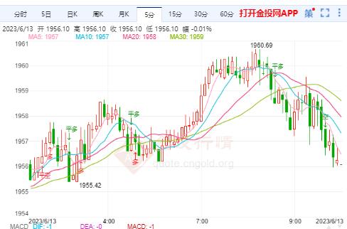 周二(6月13日)本交易日现货黄金开于1956.99美元/盎司,最高上探至1960.69美元/盎司,最低触及1955.58美元/盎司,截至发稿暂报1956.91美元/盎司,跌幅0.01%。