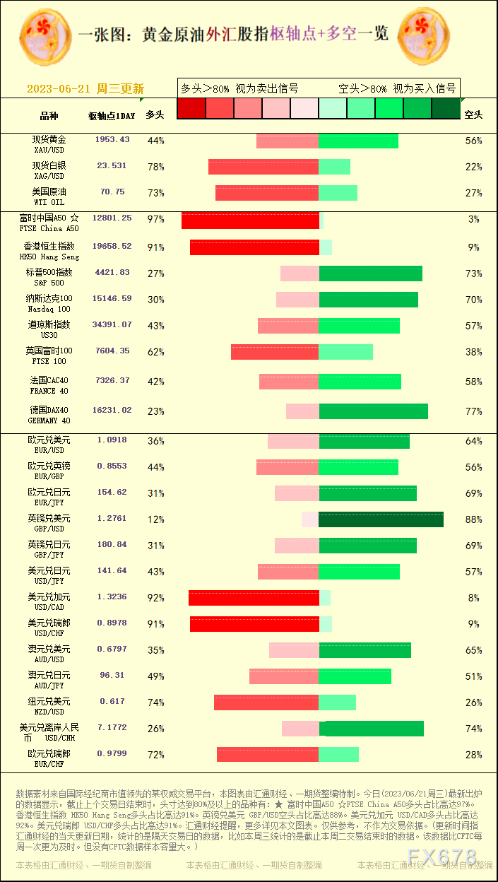 财经APP讯——一张图:黄金原油外汇股指"枢纽点+多空占比"一览。今日(2023/06/21周三)最新出炉的数据显示,截止上个交易日结束时,头寸达到80%及以上的品种有:★ 富时中国A50 ☆FTSE China A50多头占比高达97%。香港恒生指数 HK50 Hang Seng多头占比高达91%。英镑兑美元 GBP/USD空头占比高达88%。美元兑加元 USD/CAD多头占比高达92%。美元兑瑞郎 USD/CHF多头占比高达91%。 财经提醒,更多详见本文图表。仅供参考,不作为交易依据。
