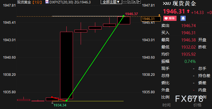 财经APP讯——北京时间周三(7月12日),美国公布6月份CPI数据,整体与核心通胀年率均超预期走低。截至发稿,现货黄金跳涨逾11美元至1946.21美元/盎司。