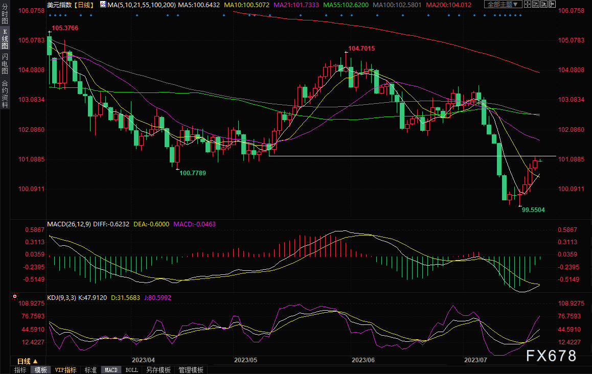 上周四出炉的美国初请失业金人数低于市场预期,也打压了美联储本周释放鸽派论调的可能性,美元指数持续反弹,上周五最高触及101.19,为7月12日以来新高,收报101.09,涨幅约0.26%,为连续四个交易日上涨。