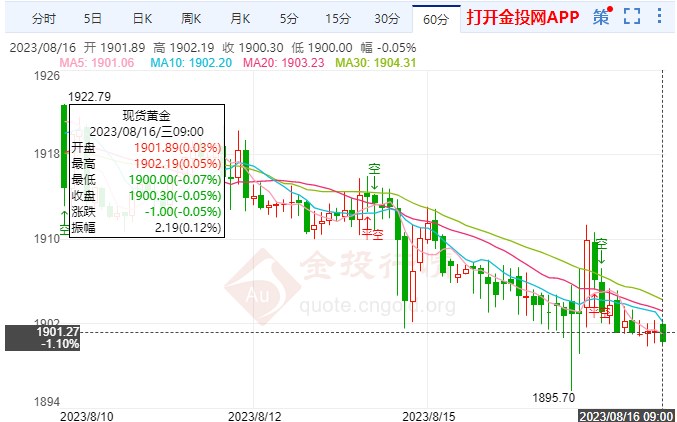 本交易日,黄金价格盘内稳定在1900美元/盎司一线上方缓涨,日内金价保持窄幅走高趋势。北京时间10:40,黄金暂报1904.00美元/盎司,涨幅0.06%。