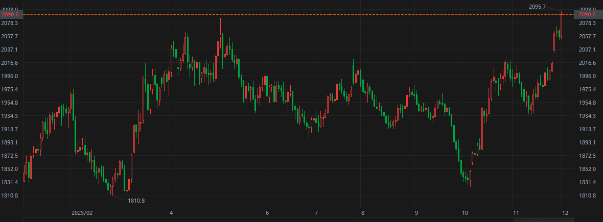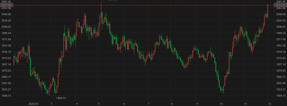 当地时间周五(12月1日),现货黄金站上2070美元/盎司,续刷5月以来新高,逼近历史高位,日内涨逾1.6%。