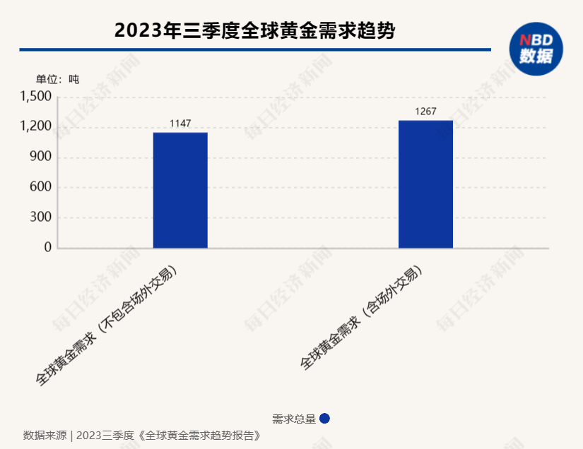 10月31日,世界黄金协会发布2023年三季度全球黄金需求趋势报告显示,全球央行持续强劲购金态势,为黄金需求提供助力。三季度黄金需求(不含场外交易)为1147吨,比五年平均水平高出8%。