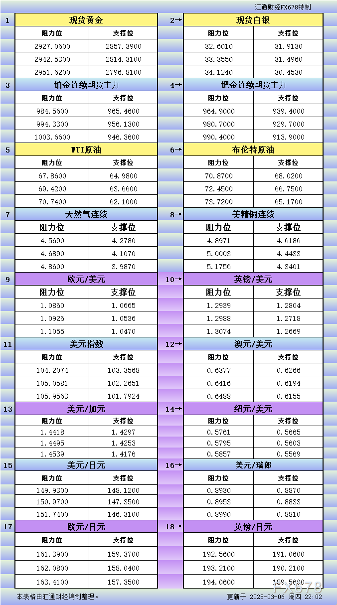 汇通财经APP讯——3月6日美市更新的黄金、白银、铂金、钯金、原油、天然气、铜(商品)以及:美元指数、欧元、英镑、日元、瑞郎、澳元、加元、纽元(热门货币对)的支撑阻力位一览。