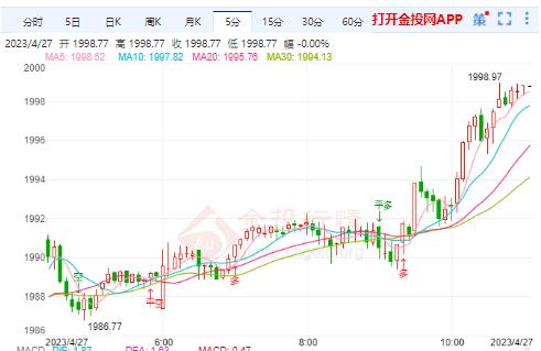 周四(4月27日),本交易日现货黄金开于1987.36美元/盎司,最高上探至1998.97美元/盎司,最低触及1987.36美元/盎司,截至发稿暂报1997.89美元/盎司,涨幅0.45%。