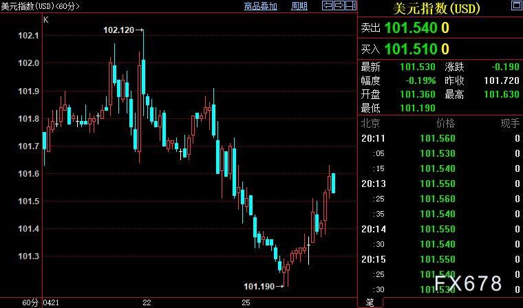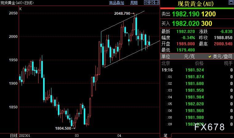 北京时间20:15,现货黄金下跌0.49%至1978.93美元/盎司;COMEX期金主力合约下跌0.53%至1989.3美元/盎司;美元指数上浮0.19%至101.545。