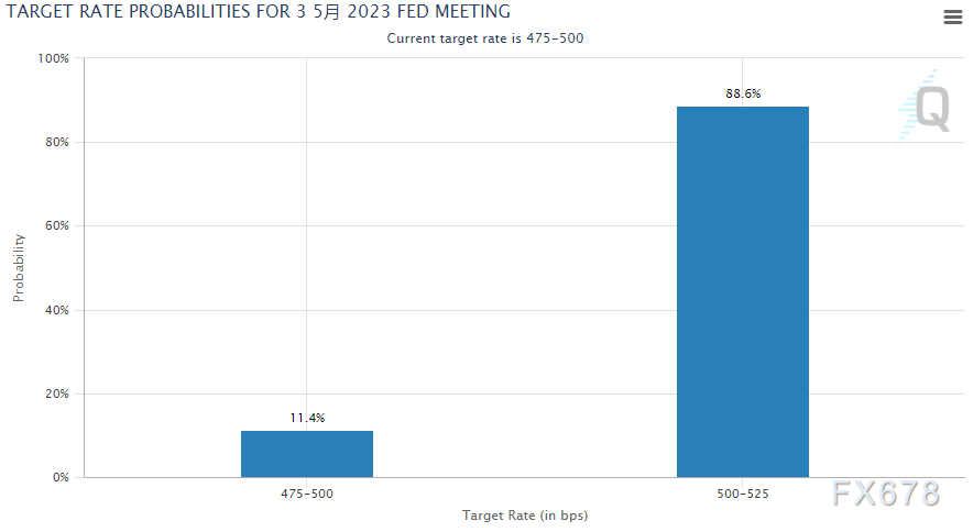 市场关注定于北京时间周二22点发布的美国4月谘商会消费者信心指数,市场预计持平前值104.2。而核心个人消费支出指数和一季度GDP增长率将于本周晚些时候出炉。投资者预计美联储在其5月2-3日的政策会议上加息25个基点的可能性为88.6%。