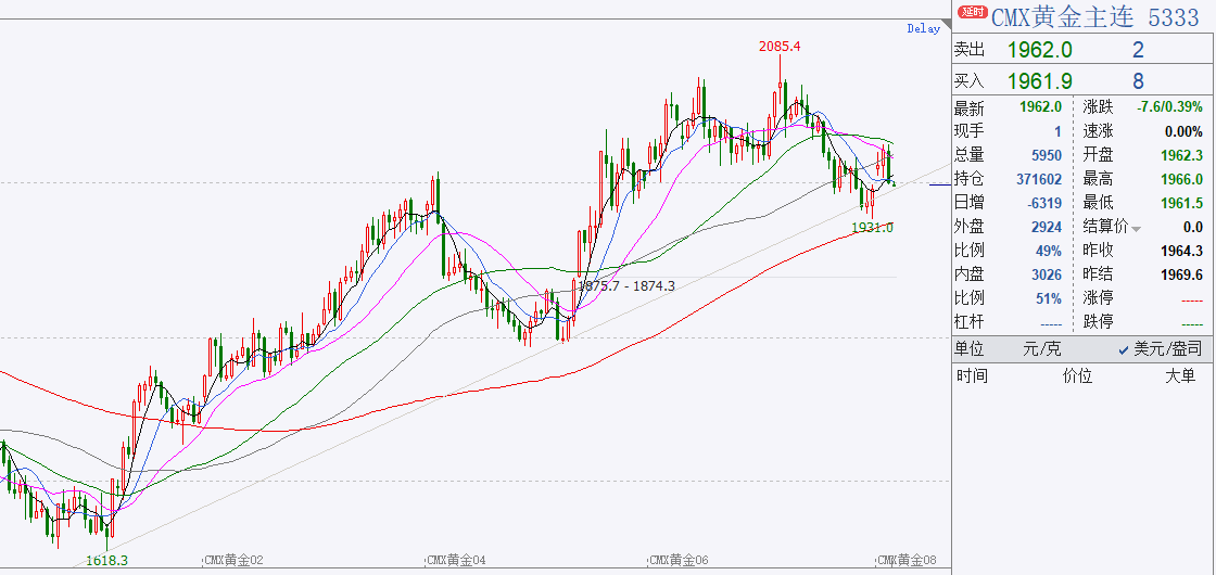 截止6月2日收盘,COMEX黄金8月合约收盘于1964.3美元/盎司,跌幅1.56%,成交204762手,持仓377921手;COMEX白银7月合约收盘于23.695美元/盎司,跌幅1.22%,成交59741手,持仓98638手。