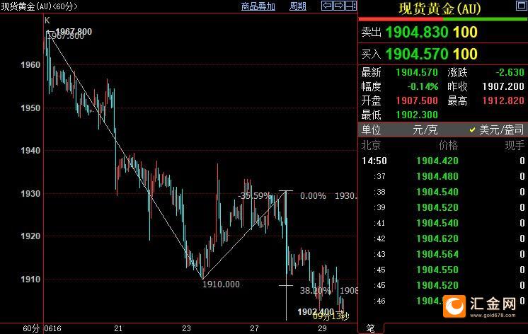 北京时间14:54,现货黄金下跌0.17%至1904.95美元/盎司;COMEX期金主力合约下跌0.52%至1912.3美元/盎司;美元指数上浮0.12%至103.122。