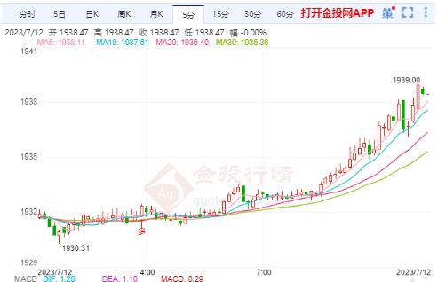 周三(7月12日)本交易日现货黄金维持涨势,今日开盘报1931.99美元/盎司,最高触及1939.00美元/盎司,最低触及1931.79美元/盎司,截止发稿及金价报1937.76美元/盎司,涨幅0.31%。