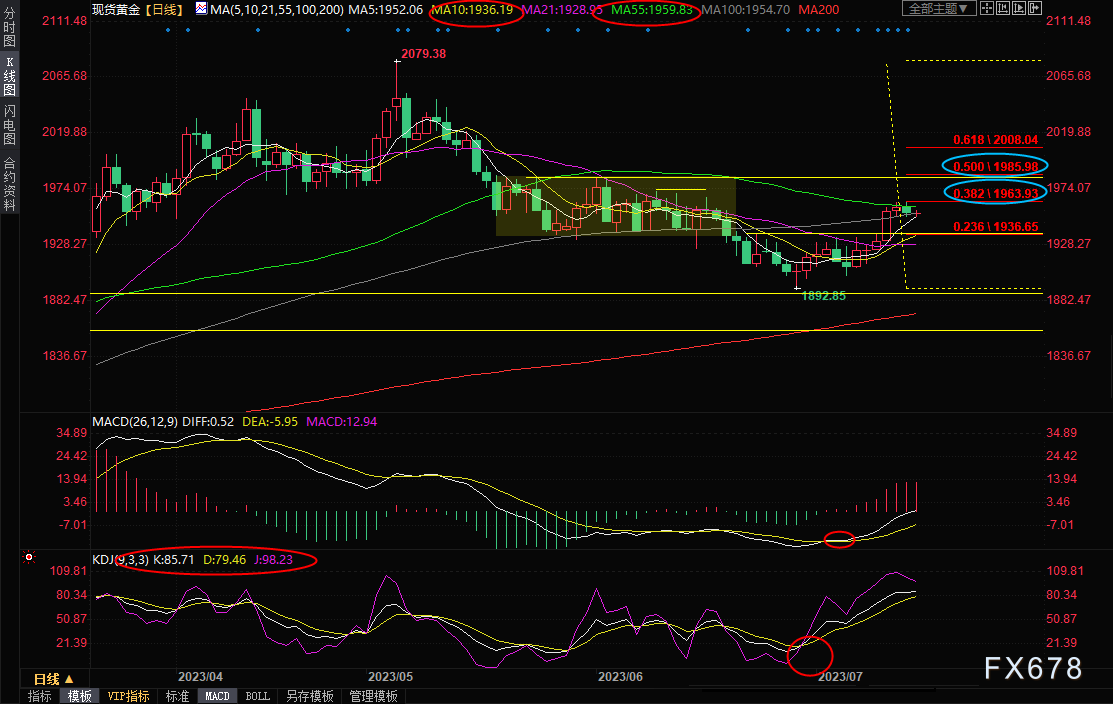 不过,KDJ也发出了短线超买信号,金价多次上冲受阻,短线需提防进一步回调风险,初步支撑参考1950关口,关键支撑参考10日均线1936.18附近位置,如果失守该支撑,则削弱后市看涨信号。进一步支撑参考21日均线1928.92和1920关口。