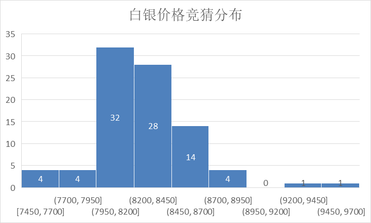 本次价格竞猜共收集到105个白银的价格预测,去除异常值后,共有88个有效价格,以下为分析结果(单位:元/千克)。