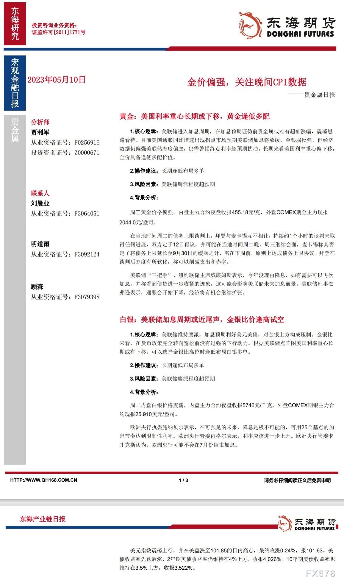 东海期货:金价偏强,关注晚间CPI数据|贵金属 来源:正大期货 作者:正大国际期货 时间:2023-05-12 白银:美联储加息周期或近尾声,金银比价逢高试空。 黄金:美国利率重心长期或下移,黄金逢低多配。 东海期货 新浪合作大平台期货开户 安全快捷有保障