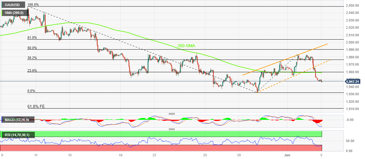 FXStreet分析师Anil Panchal提到,随着金价逼近5月份创下的年度低点1932美元附近,金价证明下行突破短期看涨通道和200均线是合理的,看跌的MACD信号加剧了下行趋势。