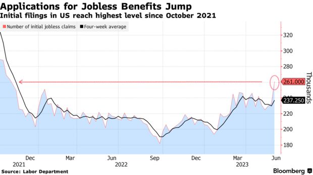 美国劳工部周四公布的数据显示,截至6月3日当周初请失业金人数增加2.8万人,至26.1万人,创下2021年10月以来的最高水平,此前预期为23.5万人,前值为23.3万人(修正后)。