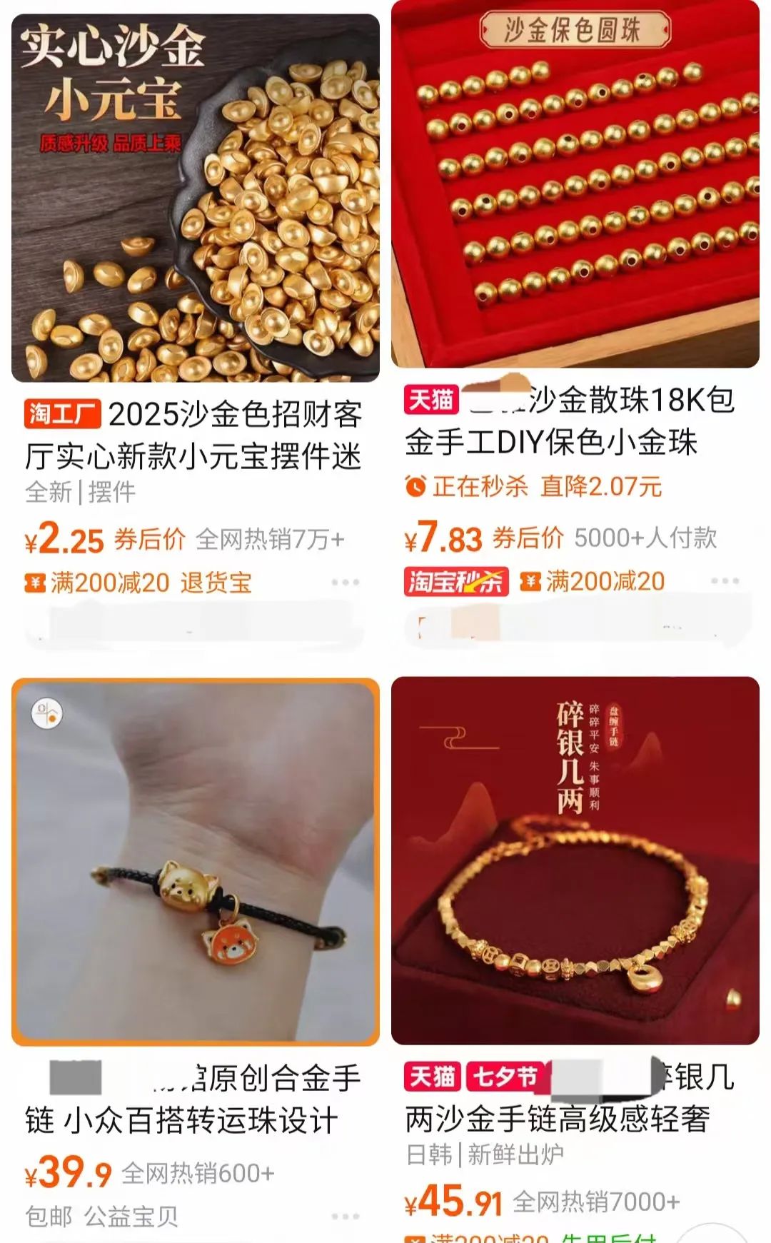 不过,在业内人士看来,沙金品质低劣、重金属超标;此外,部分商户在产品名称上玩花样,与著名品牌同音不同字,或以相近名称傍大牌,刻意模仿黄金首饰的款式(如古法手镯、光面项链、生肖吊坠),甚至在扣头、内壁刻“足金999”“Au916”等虚假钢印,误导消费者,让消费者误以为是正规黄金饰品。